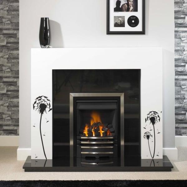 - Surround pictured in White finish with routed dandelion detail