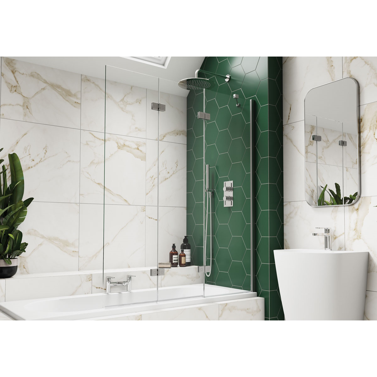 - Kudos Inspire Three Panel In-fold Bathscreen is the ultimate in over bath showering protection.