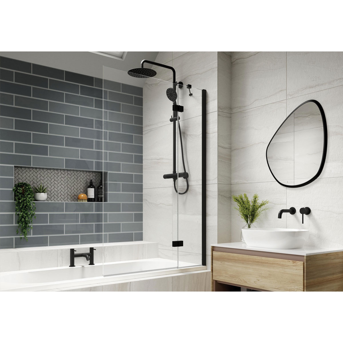 - Featuring a 305mm fixed panel that is permanently sealed to the bath and providing absolute showering protection while the larger 645mm panel opens out to allow access to shower controls and cleaning.