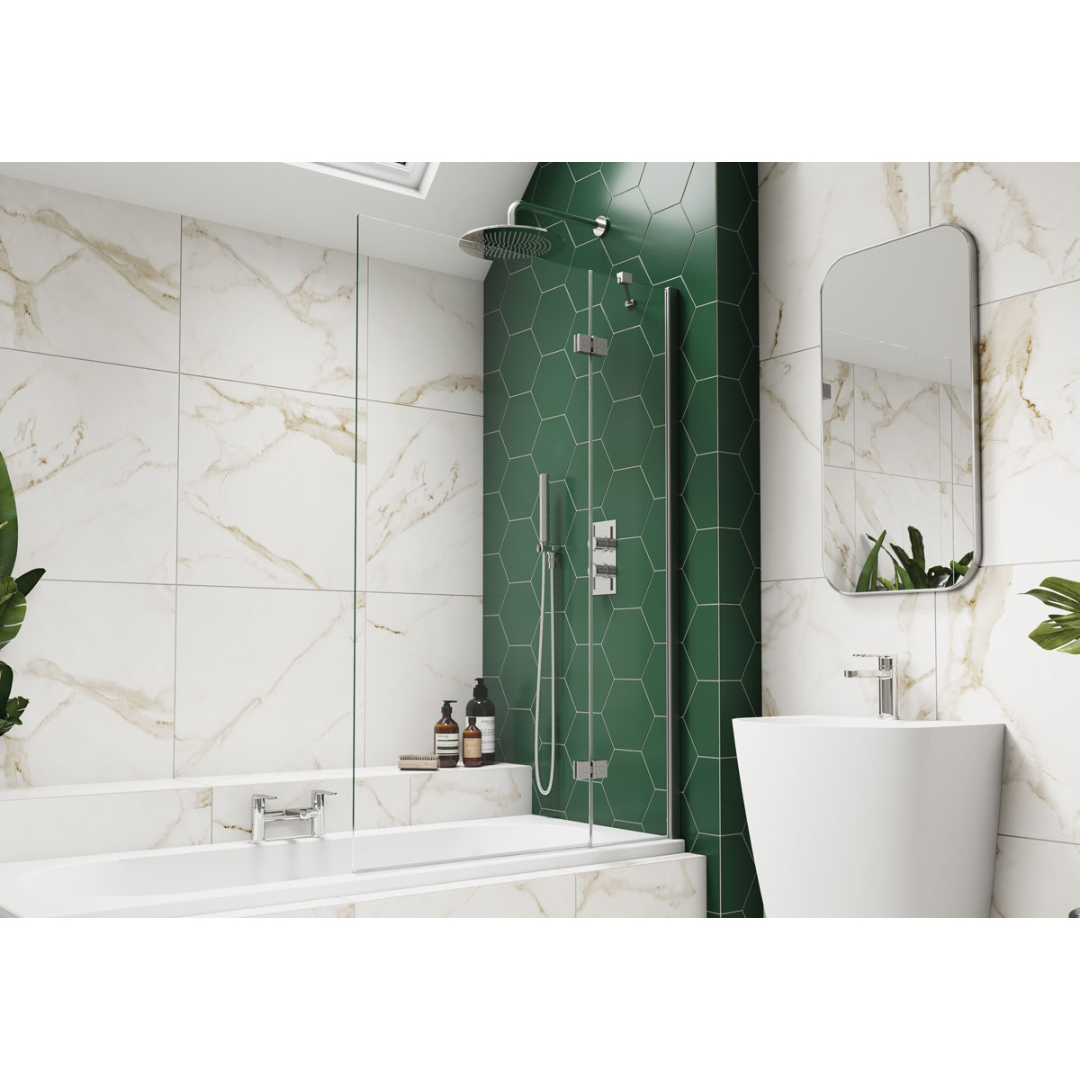 - Kudos Inspire Two Panel Out-swing Bathscreens are designed to provide an extended showering area of 950mm, yet still provide easy access to the bath.
