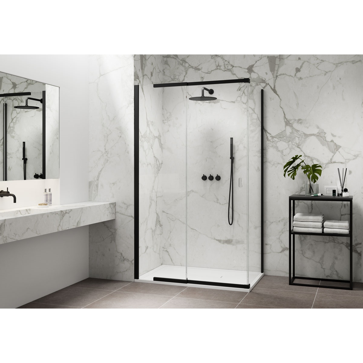 - Available in chrome or matt black the Pinnacle8 sliding corner door is available in sizes from1000mm to 1800mm with side panels ranging from 700mm to 1200 mm, perfect for the medium to large showering space.